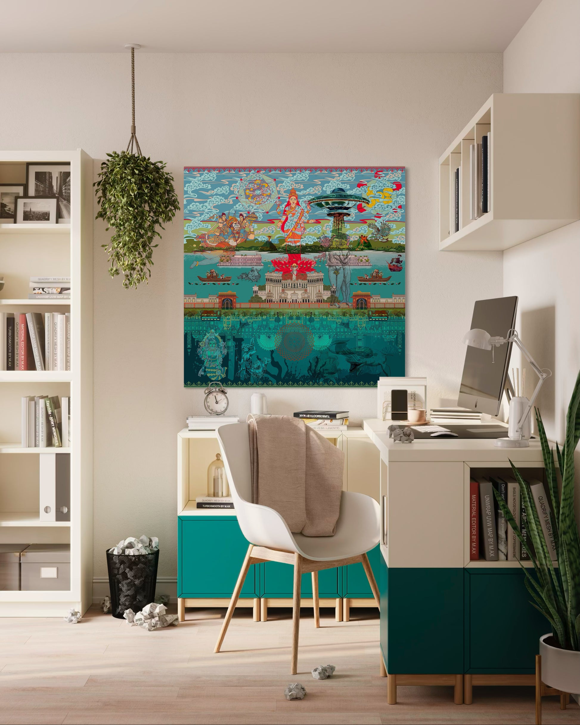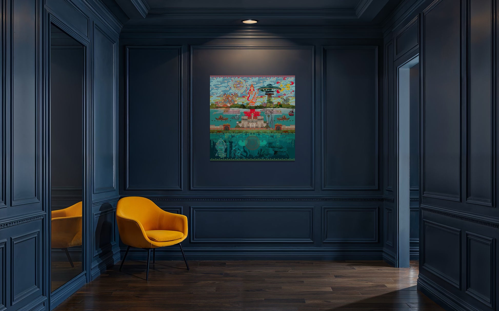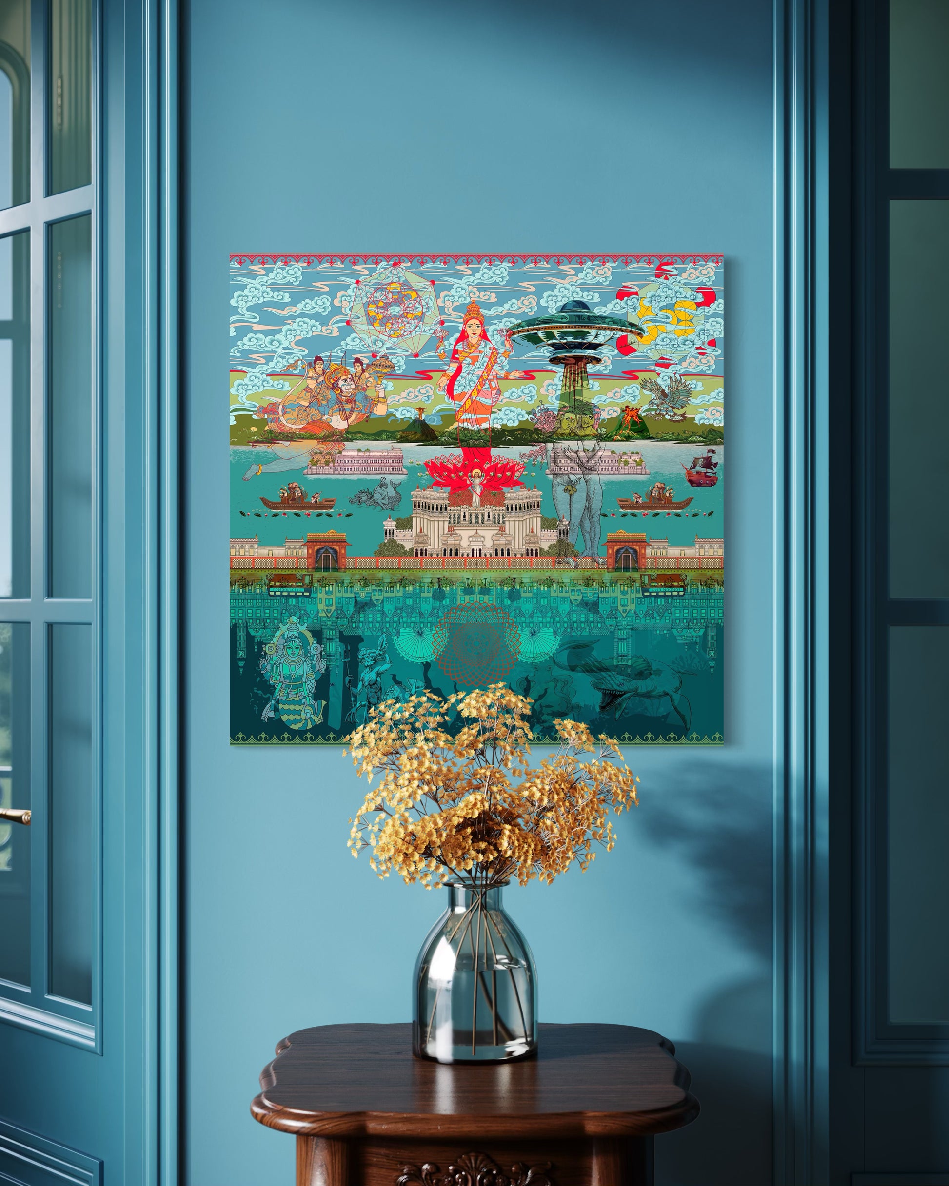In 'As Above So Below,' the canvas unfolds into a delicate tapestry that explores the profound interconnectedness of the cosmos and the earthly realm. At its heart stands Goddess Laxmi, a symbol of abundance and divinity, poised gracefully on top of a lotus. Within the petals of this lotus rests the figure of Jesus Christ, embodying the unity of spiritual traditions from East to West.