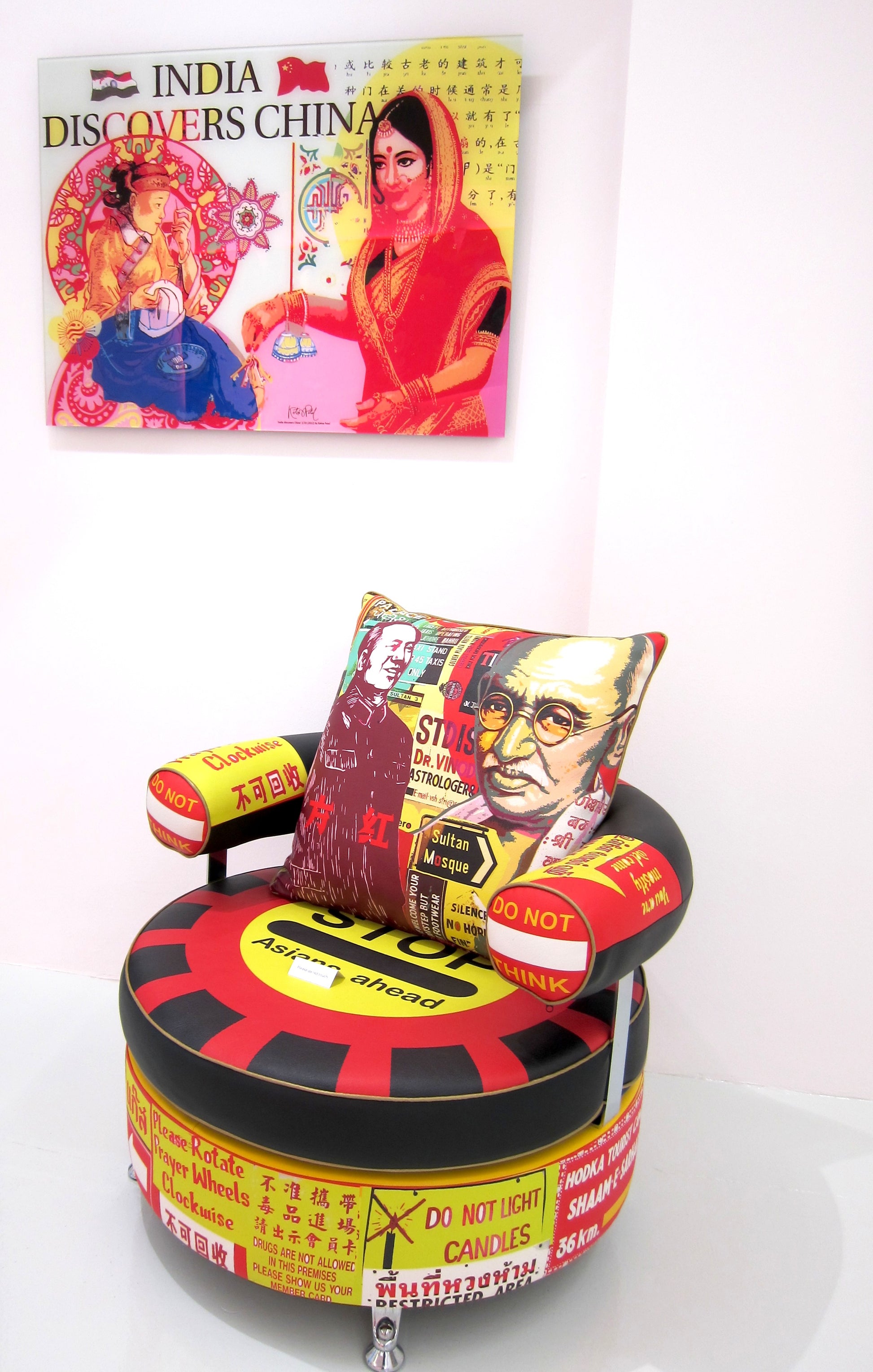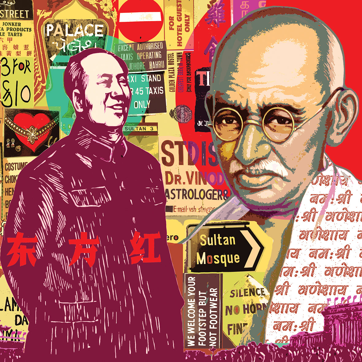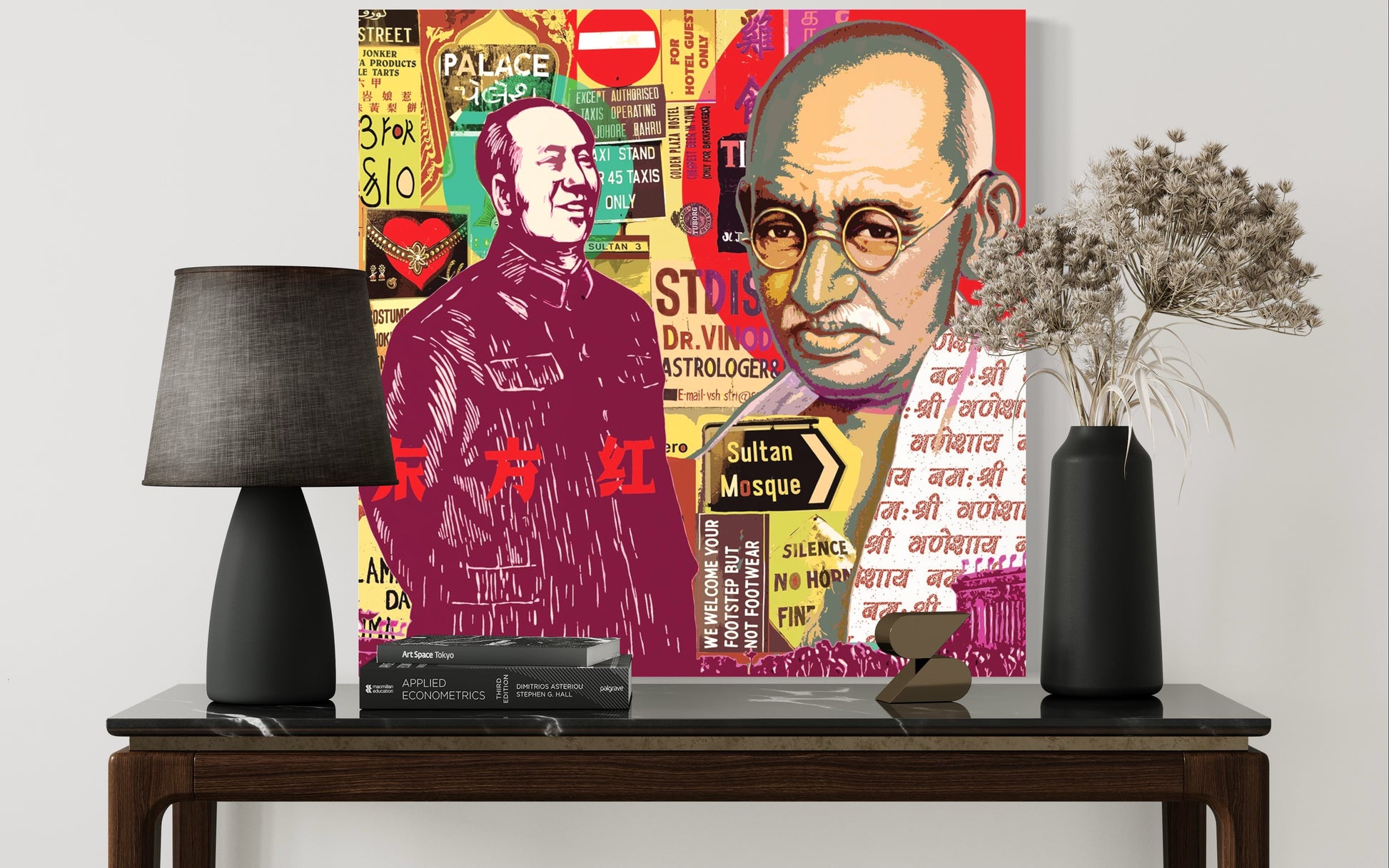 Symbolism plays a powerful role, as both Mao and Gandhi adorn currency, influencing every Indian and Chinese citizen. Their images symbolize the exchange of goods and ideas, evident in the collaged Asian street signs in the background.