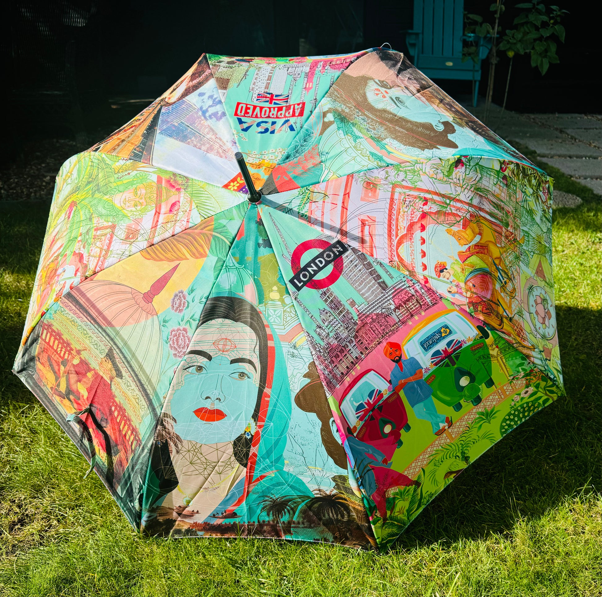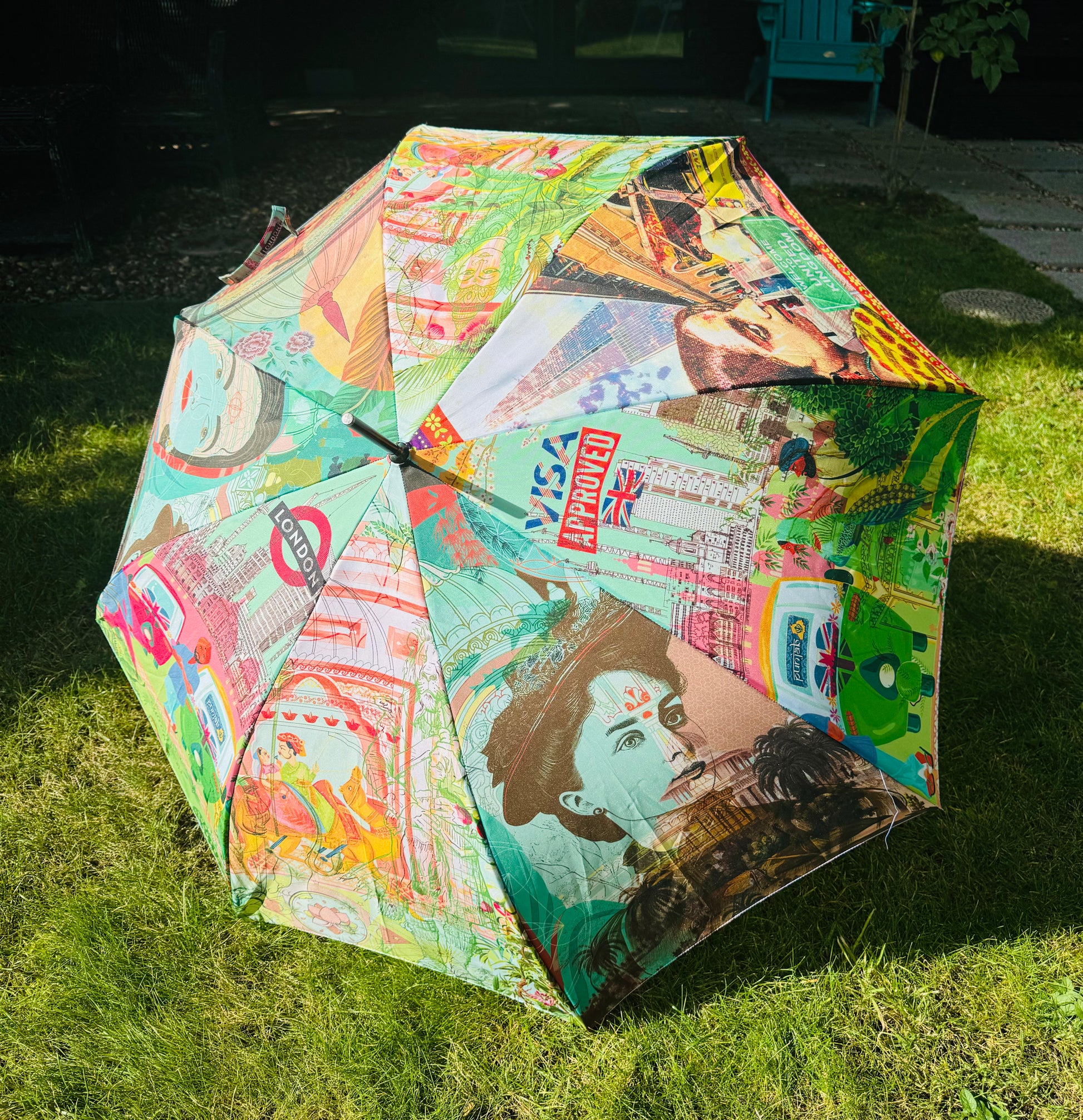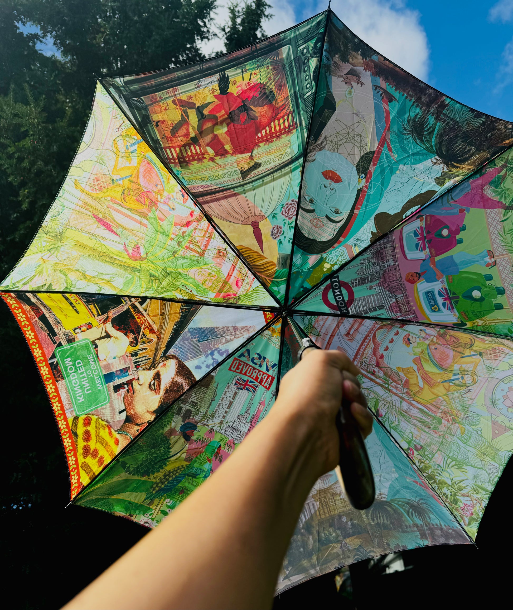 Adorned with imagery that blends mythological figures, historical landmarks, and contemporary culture from both countries, this umbrella becomes a mobile work of art, a living shelter that unites two worlds through color and creativity. It’s not just a shield from the rain, but a symbol of Indo-British fusion and pop cultural celebration, turning heads and sparking joy in the dullest of British weather. And, in true pop art style, it even doubles as a quirky upside-down lampshade when inverted, brightening your interior as much as the streets.