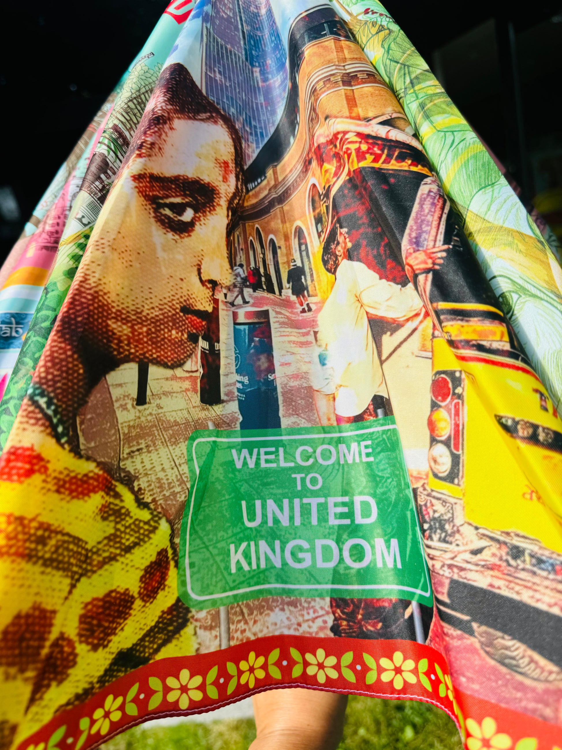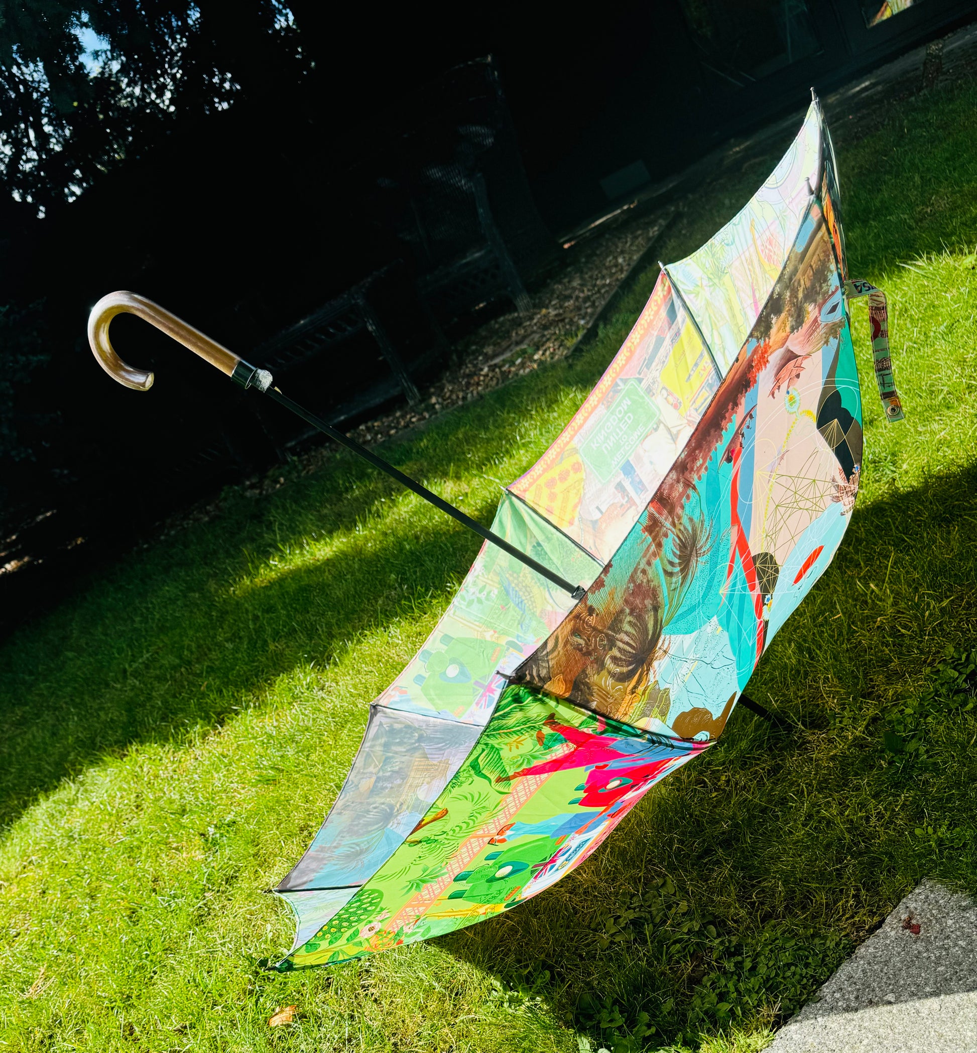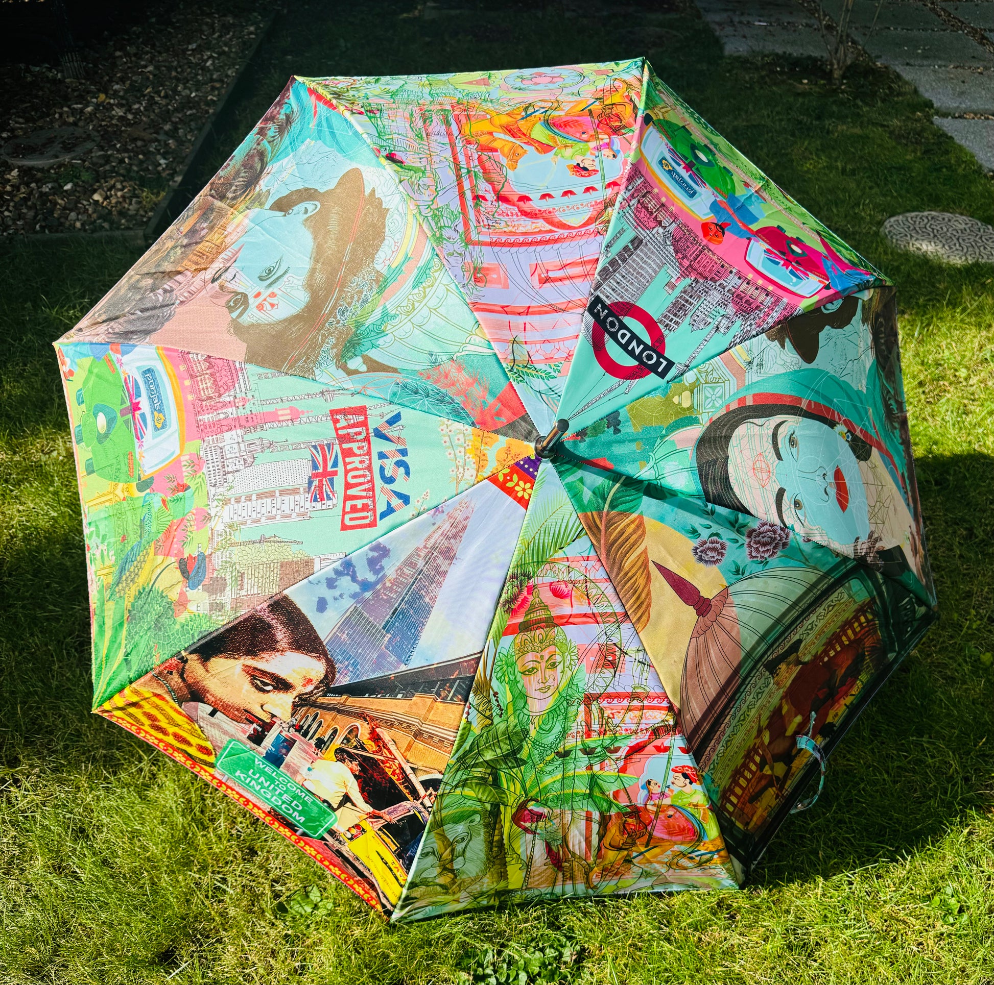 Adorned with imagery that blends mythological figures, historical landmarks, and contemporary culture from both countries, this umbrella becomes a mobile work of art, a living shelter that unites two worlds through color and creativity. It’s not just a shield from the rain, but a symbol of Indo-British fusion and pop cultural celebration, turning heads and sparking joy in the dullest of British weather. And, in true pop art style, it even doubles as a quirky upside-down lampshade when inverted, brightening your interior as much as the streets.