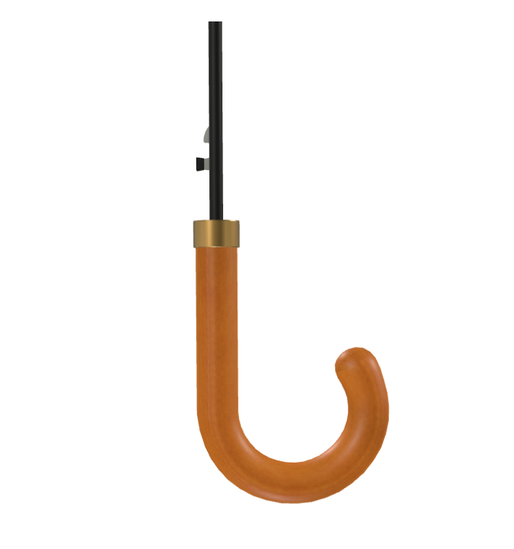 - Black plated metal ribs and a curved natural finish wooden handle.