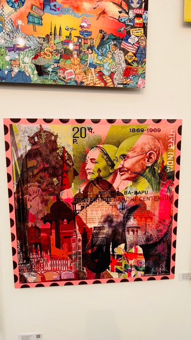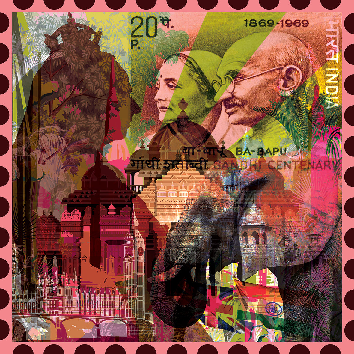 Back to the Future is a compelling artwork that weaves together the threads of history, legacy, and the ever-renewing cycles of life. In this evocative piece, the silhouette of Queen Victoria stands juxtaposed with a postage stamp featuring the iconic figure of Mahatma Gandhi and his wife, Kasturba.