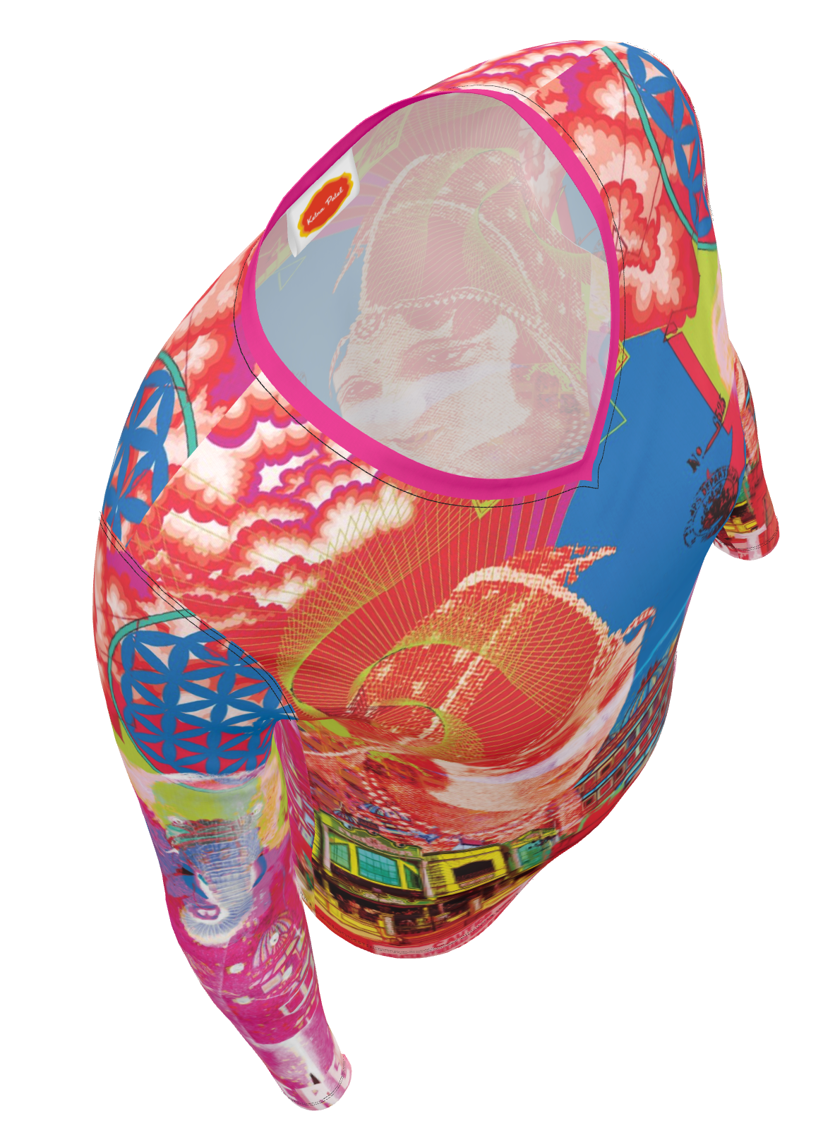 The painting "India I Was Here" is a mesmerizing fusion of colors, blending deep pink and ethereal blue hues that cascade across the canvas in a dreamlike symphony. At its core, the artwork presents a paradoxical juxtaposition of elements, bridging the realms of the cosmic and the earthly.