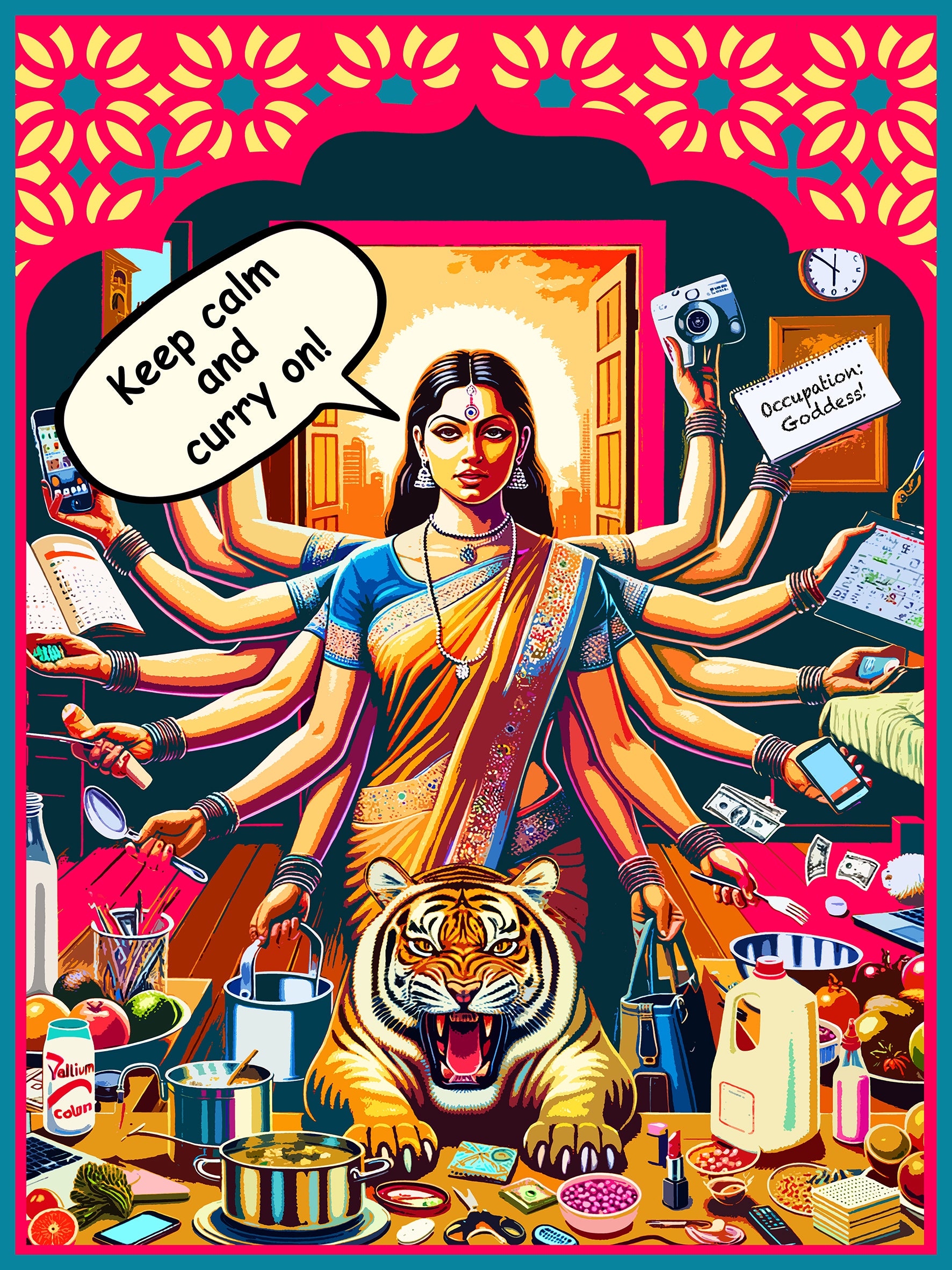 In this painting, the divine and the domestic converge in a vibrant portrayal of Goddess Amba (also popularly known as Durga), reimagined as a modern-day housewife. This painting stands as a testament to the multifaceted prowess of women, encapsulating the essence of femininity that is at once gentle and fiercely powerful. Each of the goddess's many arms, a hallmark of her mythological iconography, busily engages with the myriad tasks of daily life, symbolizing the extraordinary versatility and capability that women embody in their everyday roles.