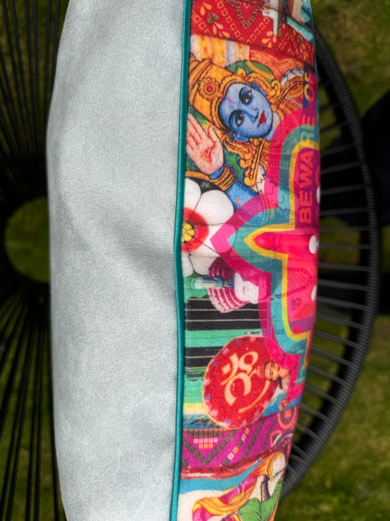 Square 40 x 40 cm (16 "), Cotton - Linen, Plain light blue back, Poly fibre filling, plain zip, sky blue piping, Ketna Patel label