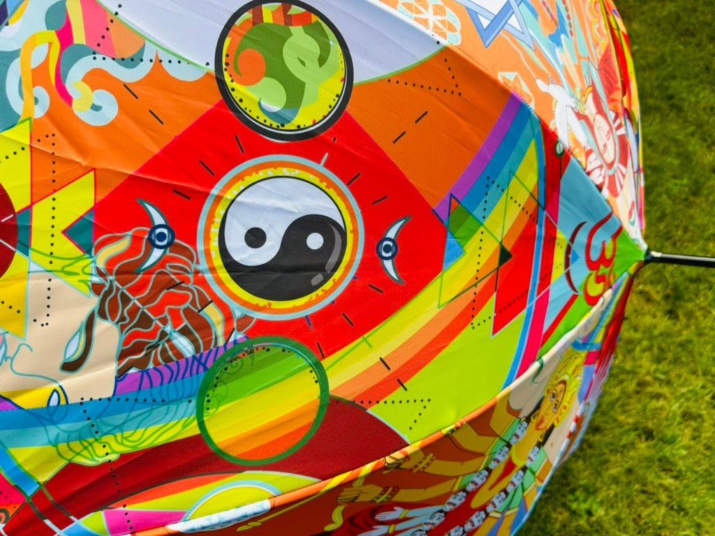 Adorned with intricate imagery honouring nine goddesses from diverse cultures, it weaves together archetypes of the divine feminine, celebrating their manifold forms and energies. From Mother Mary to Goddess Tara, Isis to Kali Maa, this umbrella becomes a mobile altar, merging Heaven and Earth under the warm, radiant spectrum of Sun energy—the most vital life force for humanity. Saturated in rich hues of orange, it’s a bold homage to the sacred feminine, certain to brighten the greyest British skies and evoke awe wherever it goes.