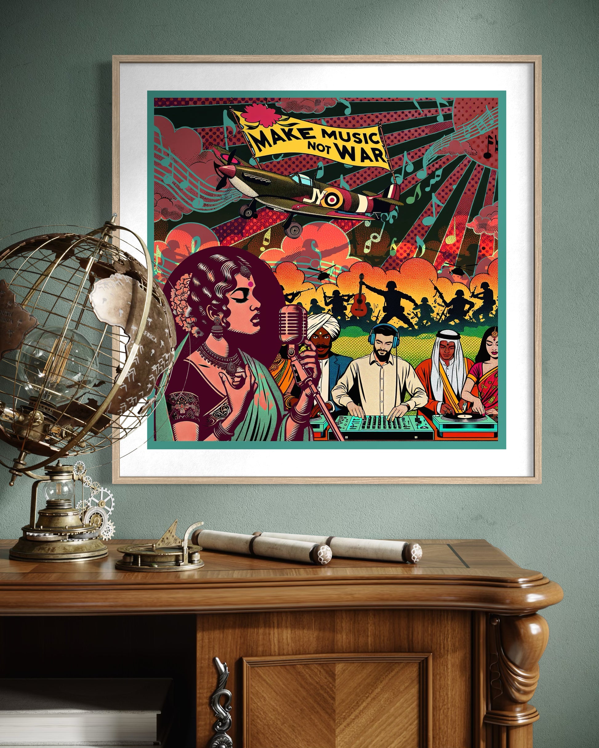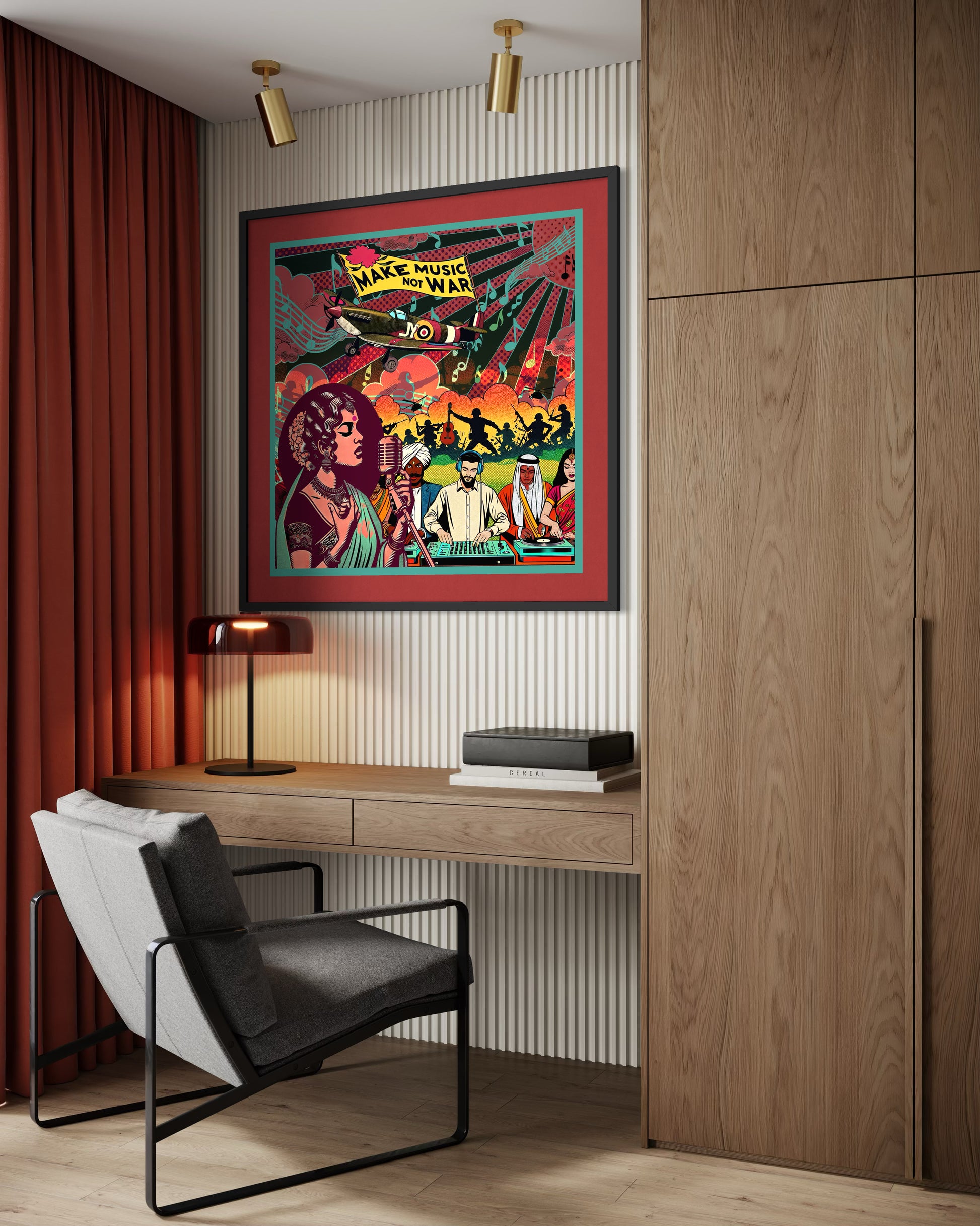 “Make Music Not War” is a reminder of what humanity sounds like when it remembers its heart. This artwork honours rhythm, voice and vibration as ancient medicines — stronger than noise, stronger than fear, and stronger than the forces that profit from our divisions.