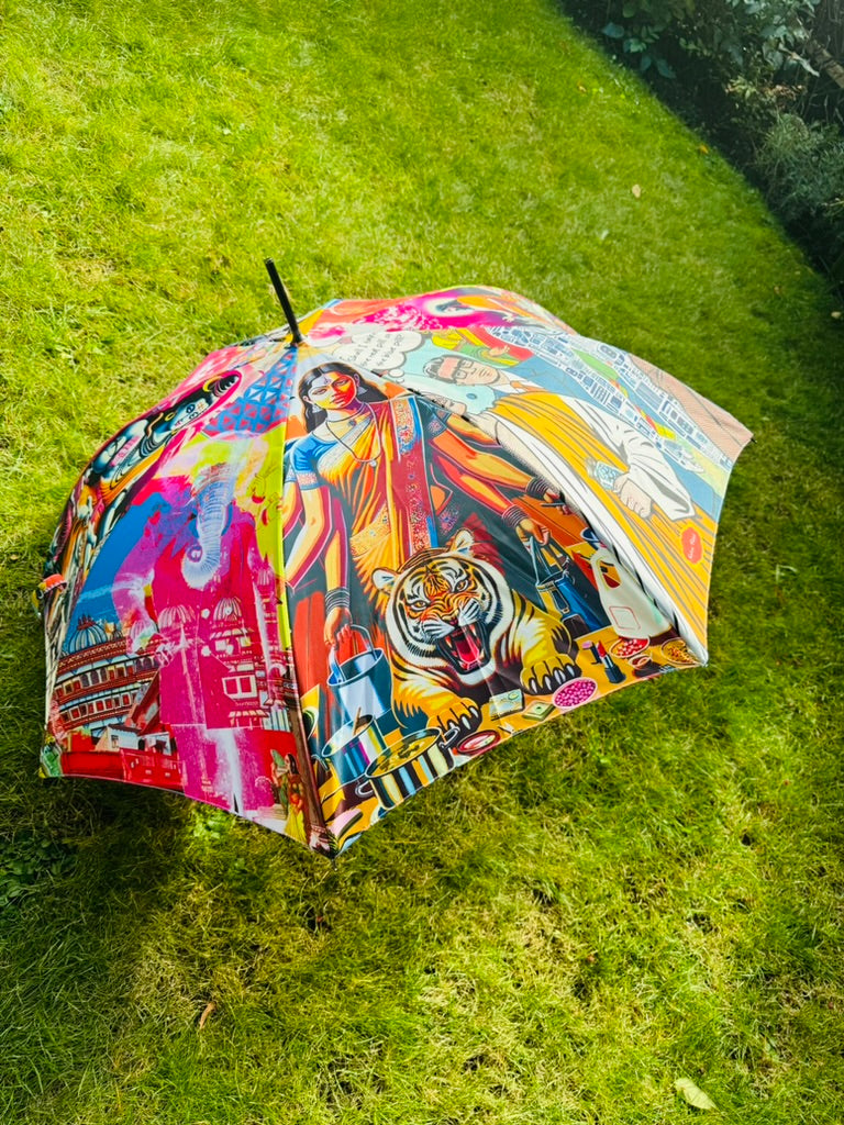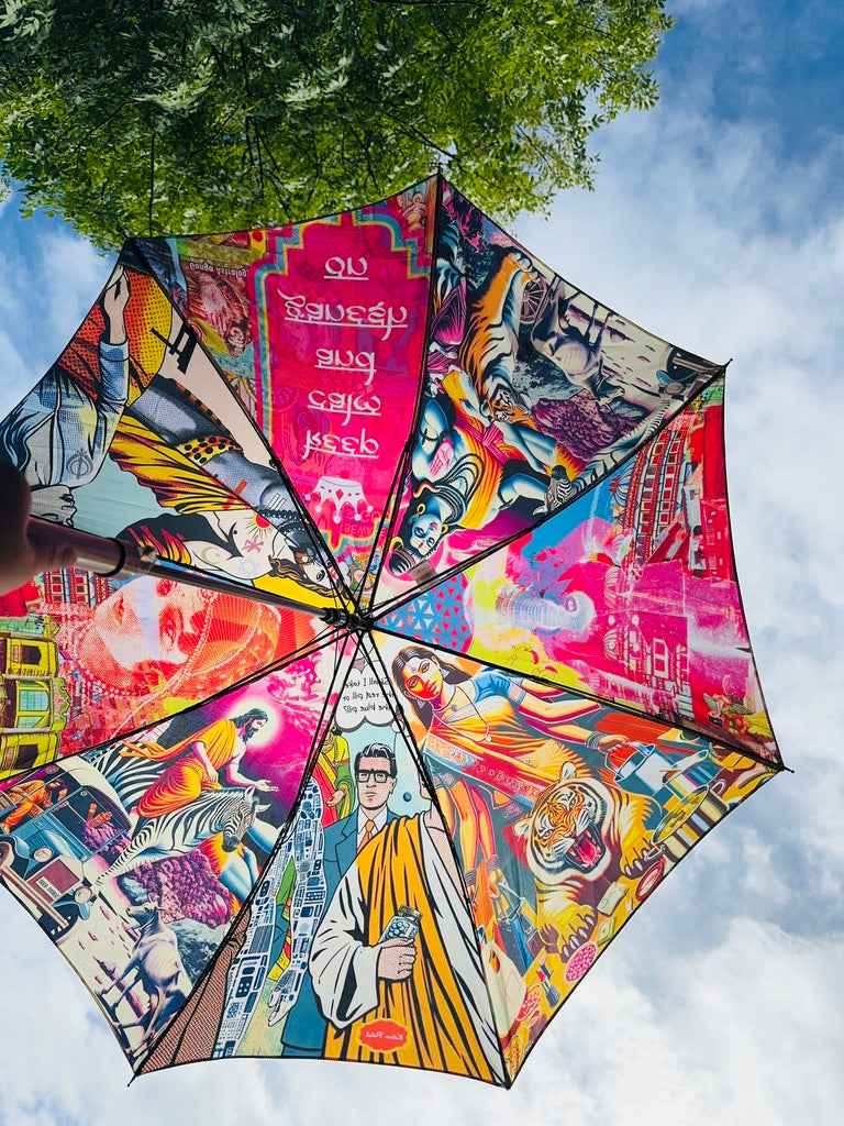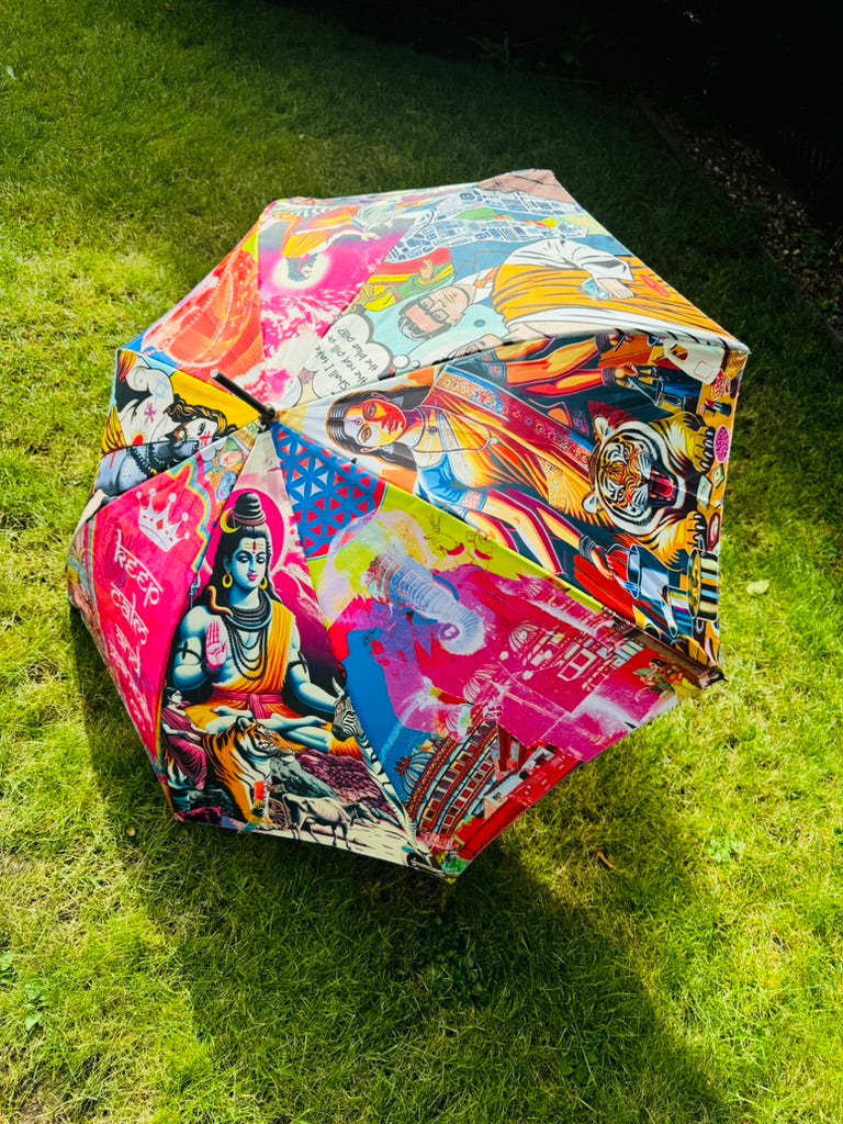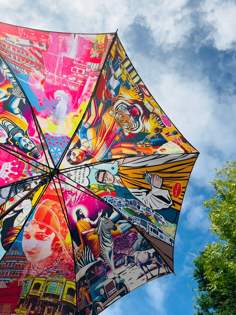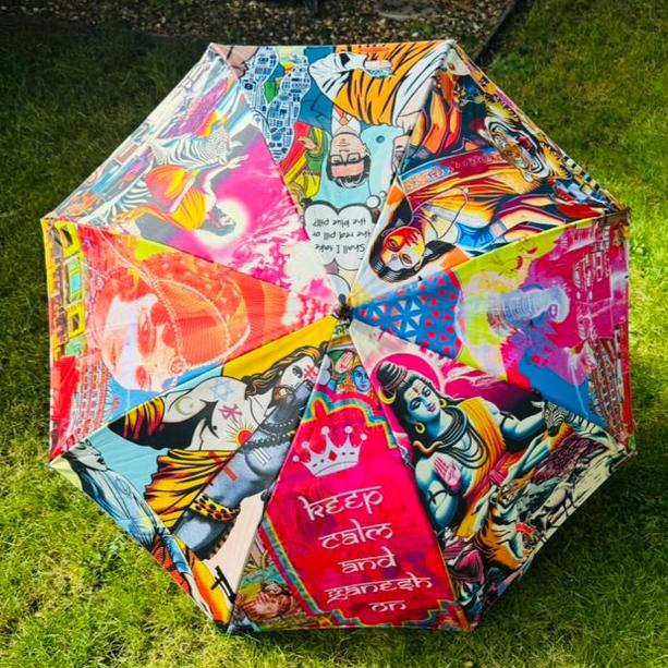 From AI to Jesus and Shiva sharing a cosmic conversation, to Goddess Amba reimagined as a modern-day housewife, this umbrella blurs the lines between the divine and the ordinary. It serves as a celebration of the interconnectedness of all beings, bridging the spiritual and the everyday with humor, reverence, and artistry.