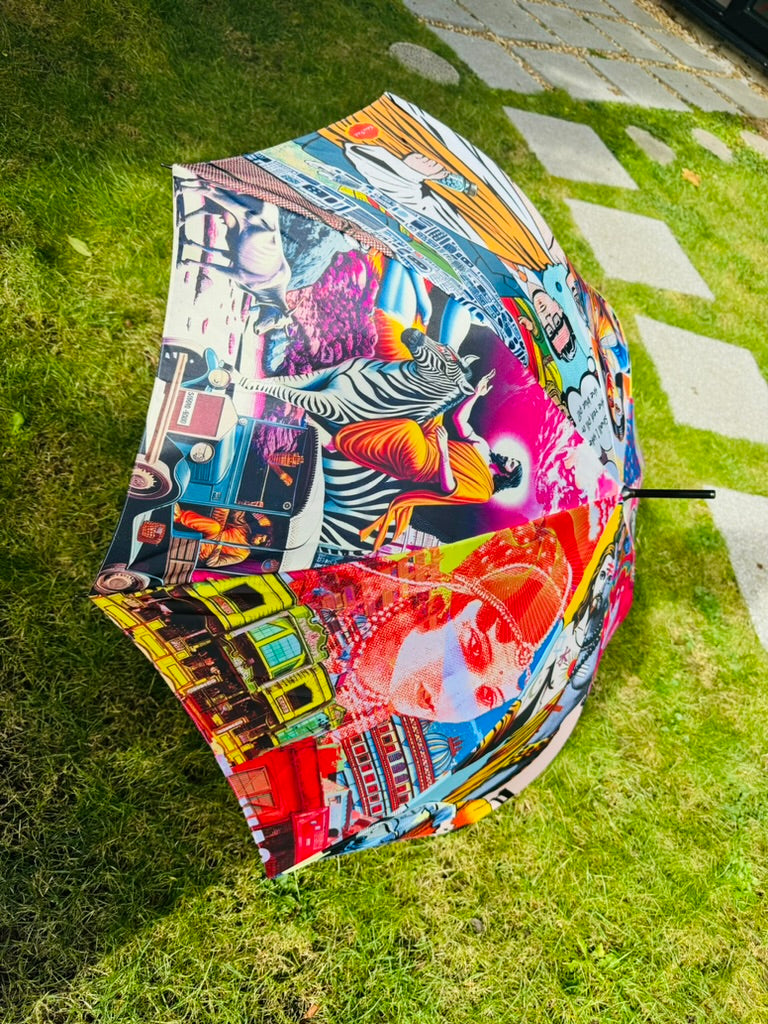 In this striking piece, the umbrella transforms into a surreal antenna, connecting you to a universe where ancient deities and modern realities collide. Bold, saturated colors and intricate details turn a rainy day into a meditative, joyous experience. Carrying this umbrella is like holding a piece of the cosmos above your head—inviting protection, creativity, and divine energy wherever you go.