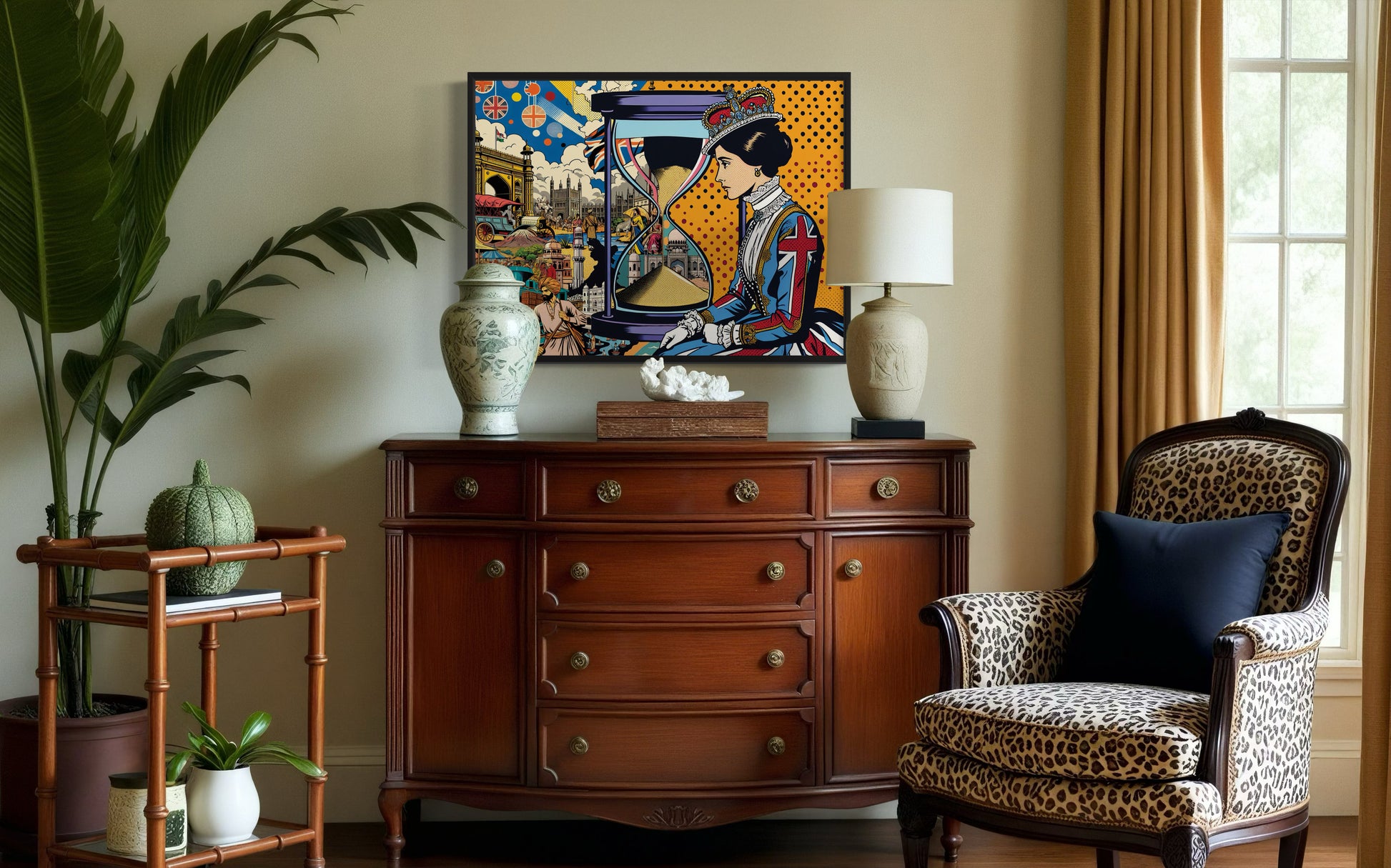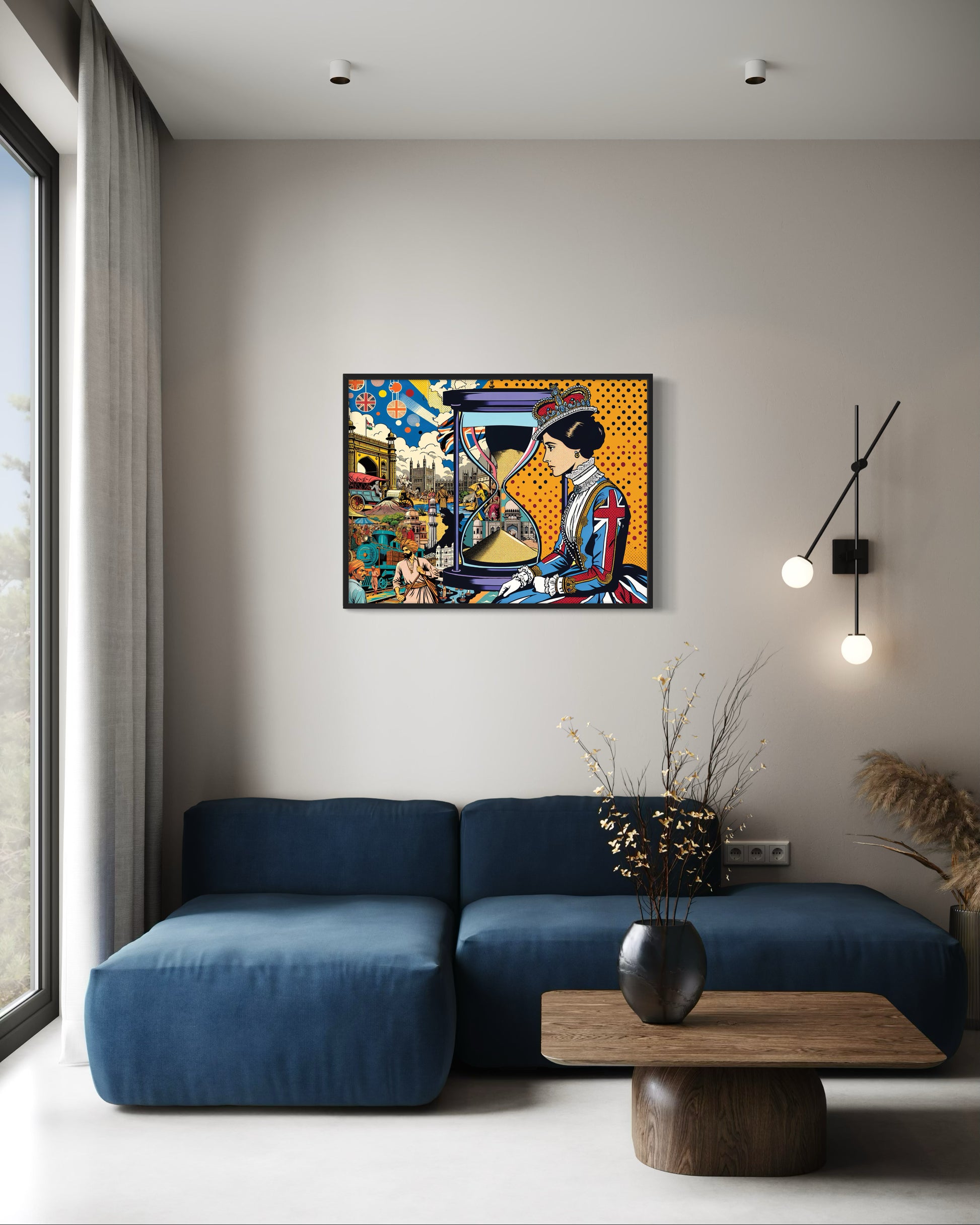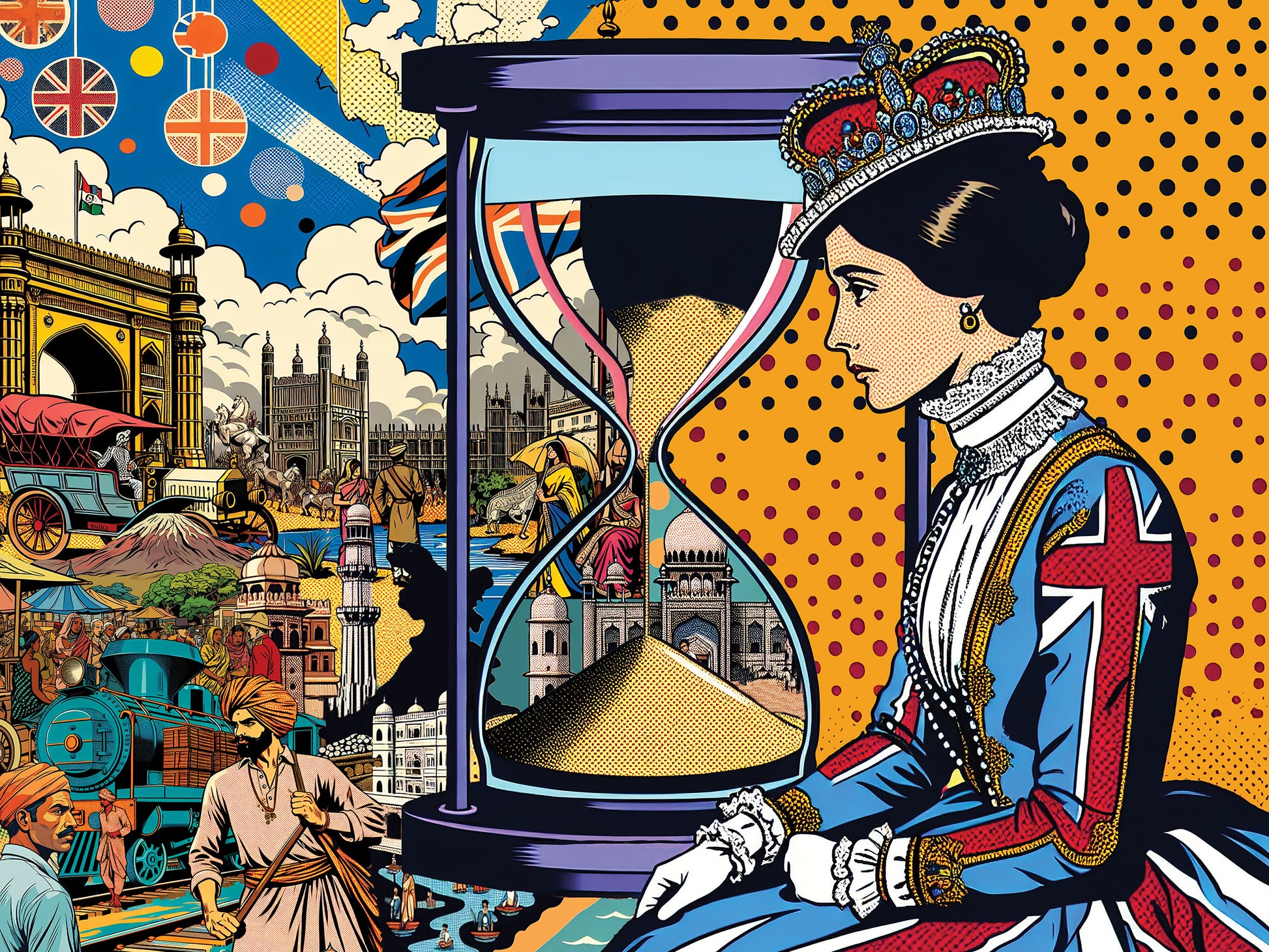 Sands of Time is a visual meditation on the fluidity of history and the impermanence of power, identity, and belonging. The canvas is split into two worlds: one, a dense mosaic of British colonization in India and East Africa—faces etched with stories of migration and displacement, landscapes scarred by conquest, and the weight of a fractured legacy. Opposing this complexity is a solitary female monarch, cloaked in British regalia, her crown heavy with the burden of empire. She gazes at a sand timer, its shifting sands a poignant metaphor for time’s relentless march.