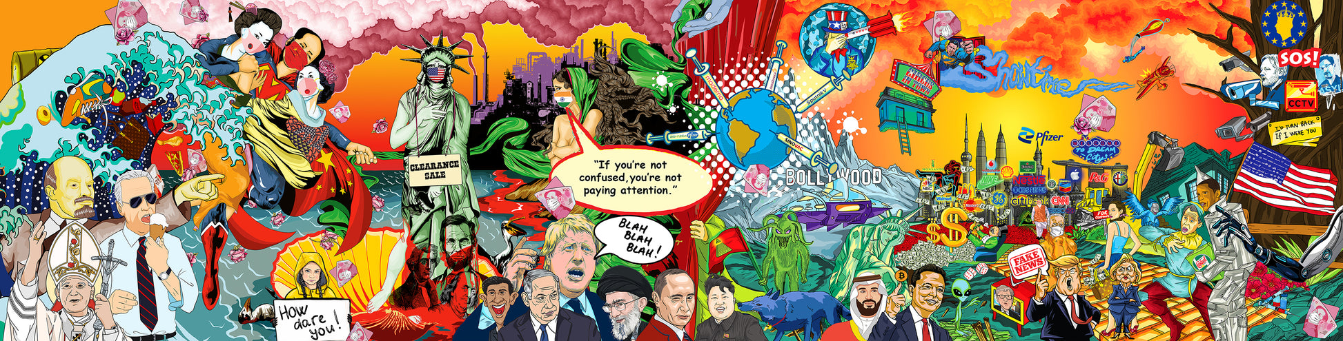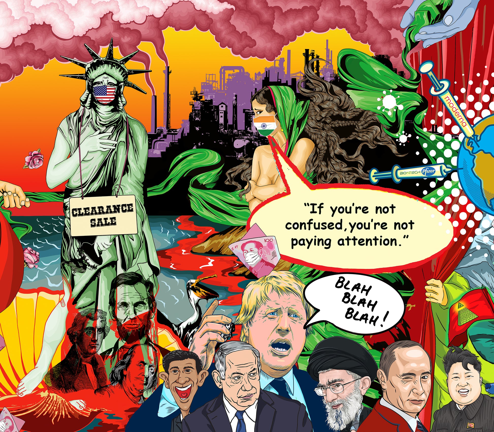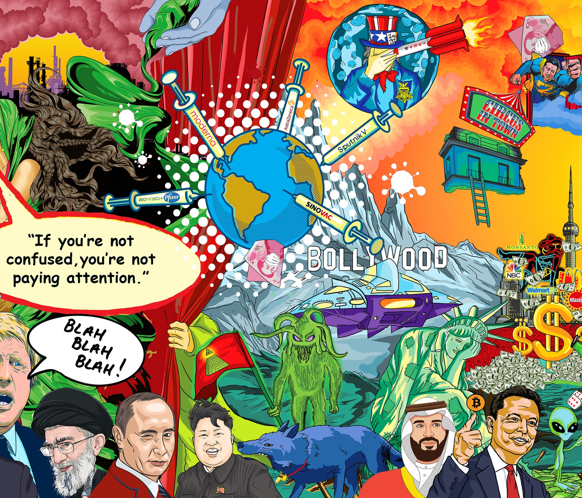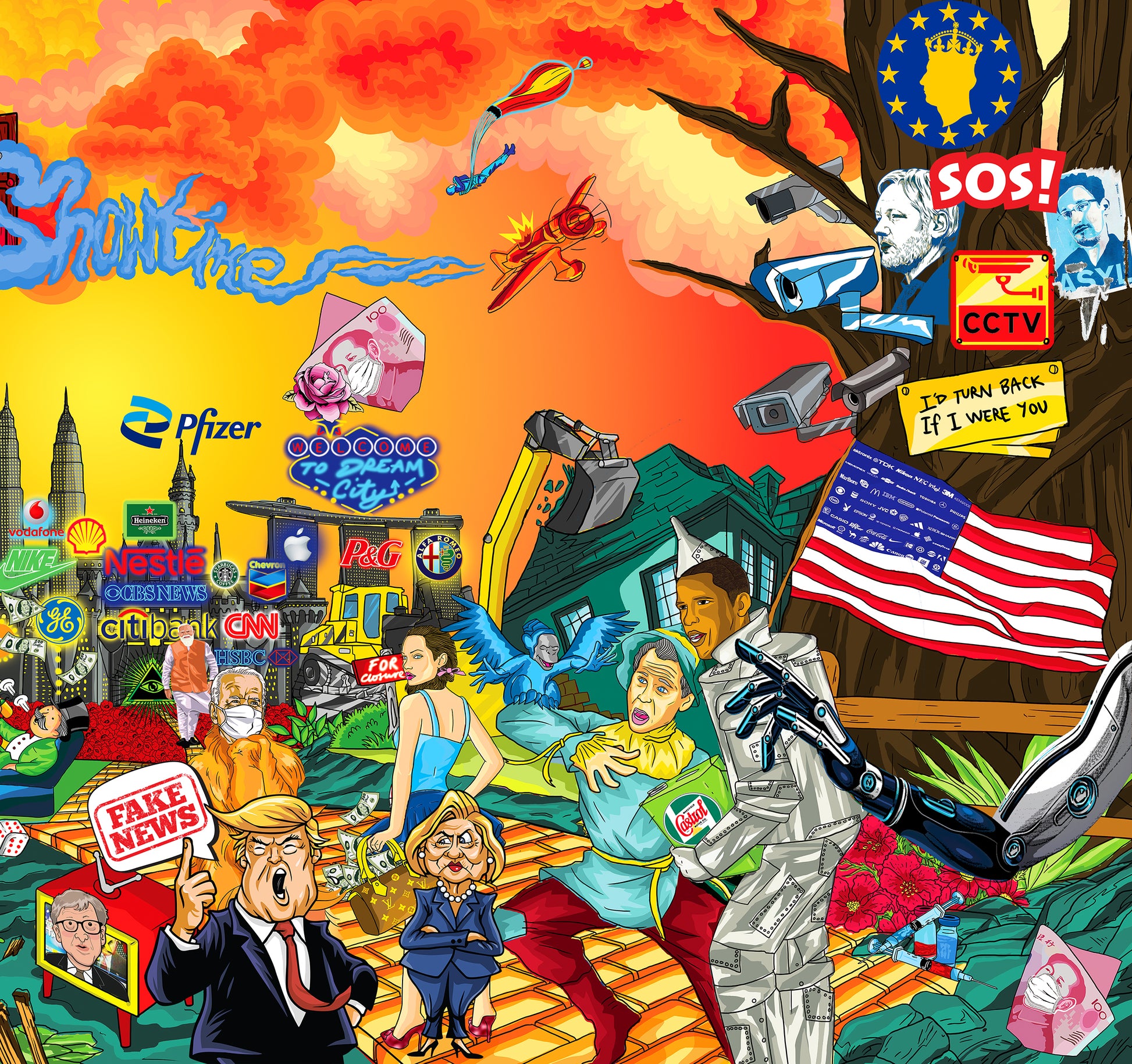 Amidst this dystopian landscape, dissenters like Julian Assange and Edward Snowden are depicted as imprisoned or exiled, highlighting the chilling reality of authoritarian rule and constant surveillance. References to aliens, spaceships, polluting oil refineries, greed, and political puppetry further underscore the chaotic and surreal nature of our world.