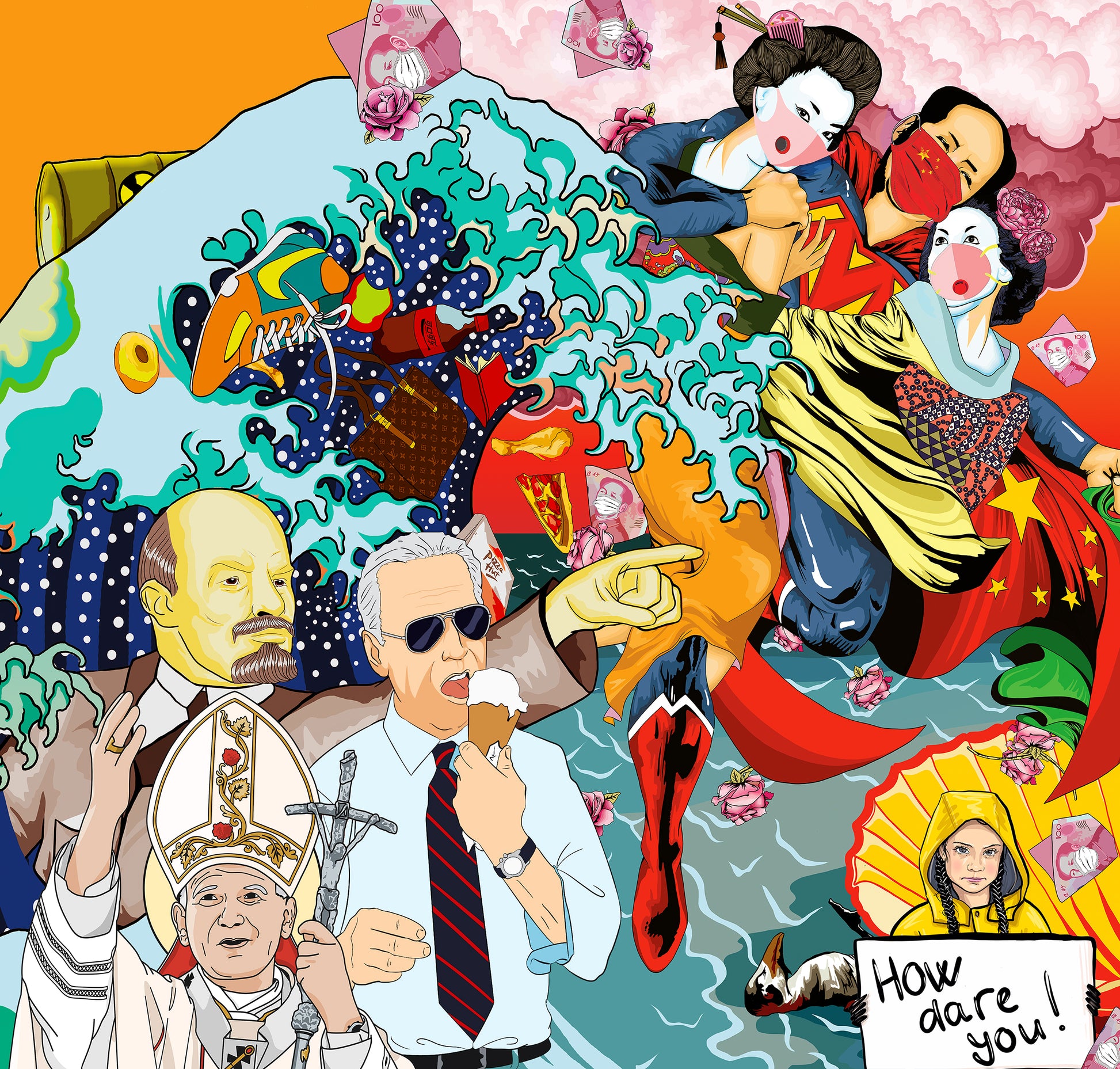 On the left side of the canvas, Hokusai's "The Great Wave" looms ominously, symbolizing the imminent threat of change and transformation that engulfs our current reality. Amidst this chaos, a cast of political protagonists including Joe Biden, Macron, Trudeau, Karl Marx, Abraham Lincoln, Rishi Sunak, Boris Johnson, Putin, Trump, Hillary Clinton, and Barack Obama populate the scene, reflecting the diverse spectrum of power and influence in our world.