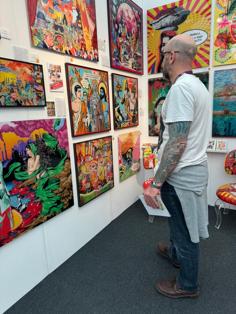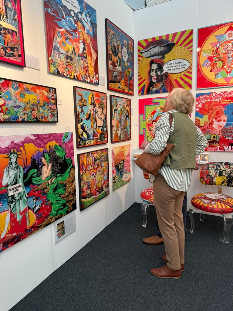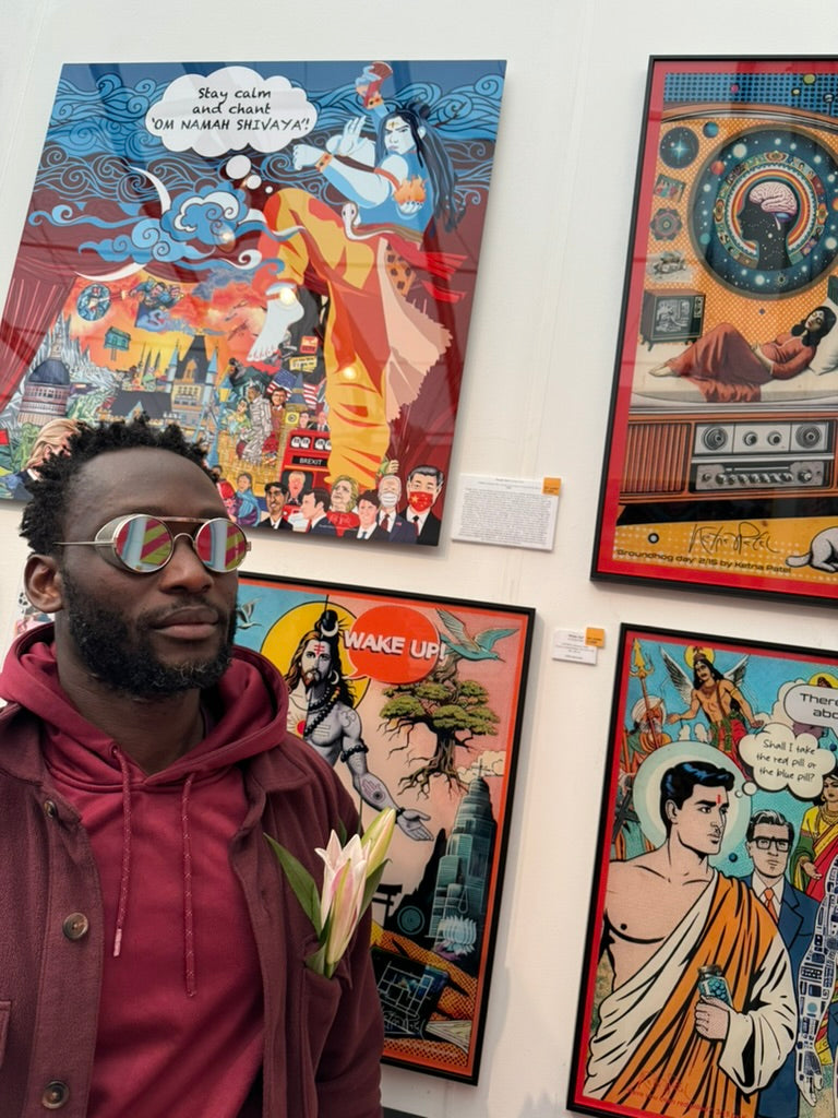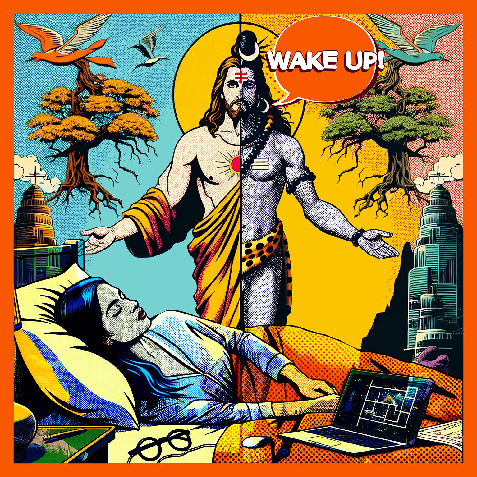 In "Wake Up," a man split in two—half Shiva, half Jesus—stands over a woman asleep on her bed, a laptop open over her. Floating trees with exposed roots fill the background, symbolizing consciousness untethered from the body, just as these trees are unanchored from the earth. This painting explores the divide between our conditioned selves and our true essence. Through the symbolism of Jesus and Shiva—figures of resurrection and renewal—it invites us to awaken to our "real" selves, the soul that transcends ego and cultural programming. This fusion of Eastern and Western spiritual philosophy urges viewers to shed old constructs, reconnect with one another, and embrace the possibility of transformation and self-discovery each day.
