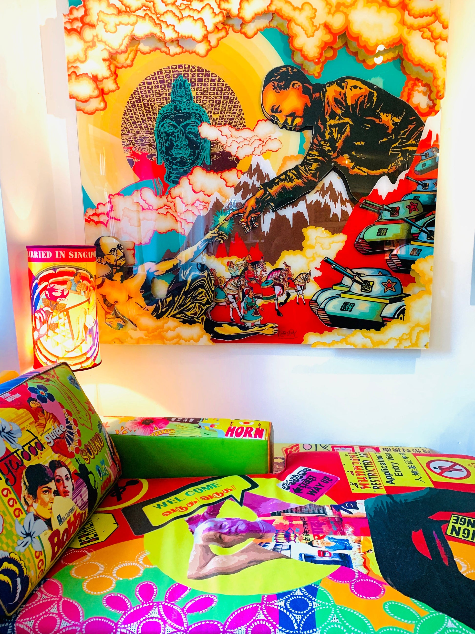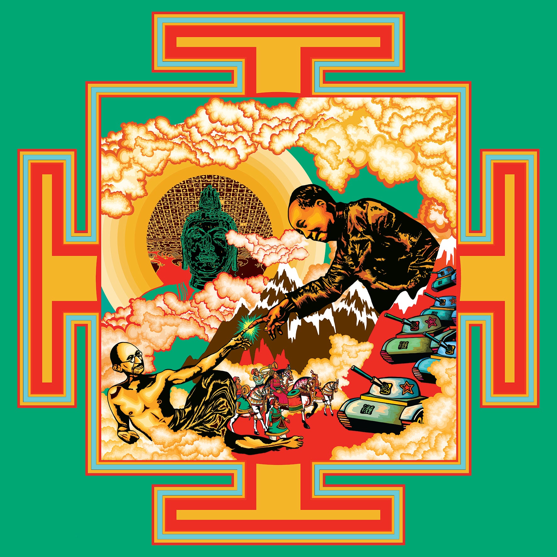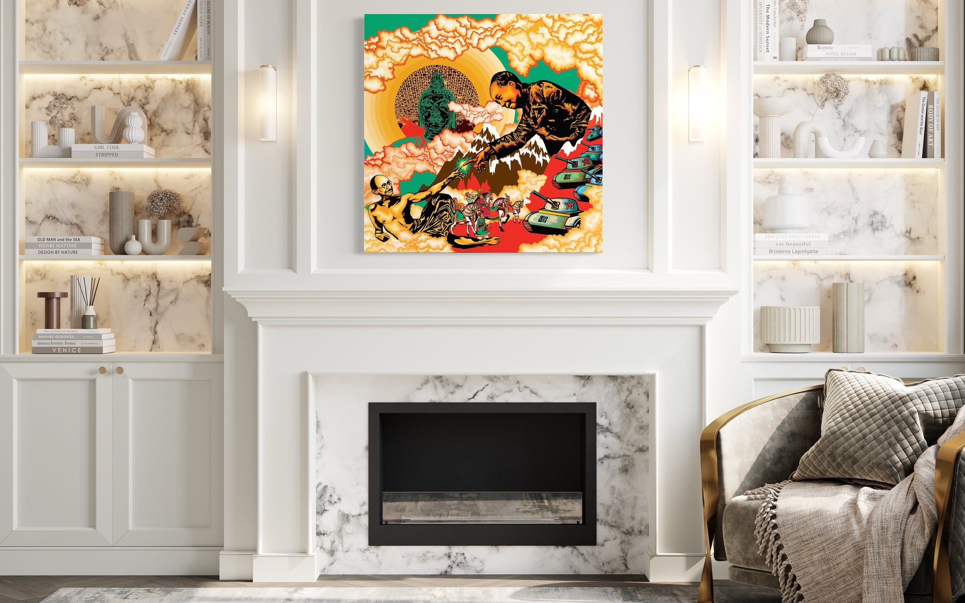 Additional notes: Using Michangelo's 'Creation of Adam' painting as a metaphorical anchor, Ketna Patel has composed a contemporary re-interpretation between God and mankind. Under the invisible but ever watchful eye of the Divine (represented here by Lord Buddha), the composition is showing two protagonists of modern Asia in symbolic positions. India is represented by a bare chested Mahatma Gandhi, who is vulnerable in his defencelessness as he is lying down on his back. China, on the other hand (represented by Mao) is in a threatening standing position, therefore having the upper hand. India is (naiively?) sending out celebrationary musical parties on horseback. China, on the other hand has its army tanks on standby. How is one to interpret the outcome of this snapshot? Could this moment be the creation of war, or would it indeed be the creation of peace? We do not know what the future holds.