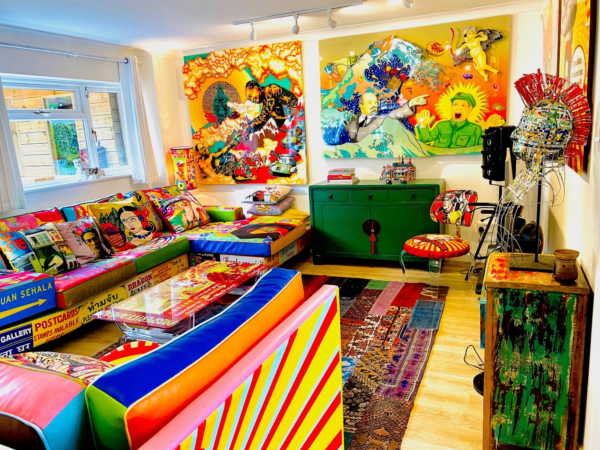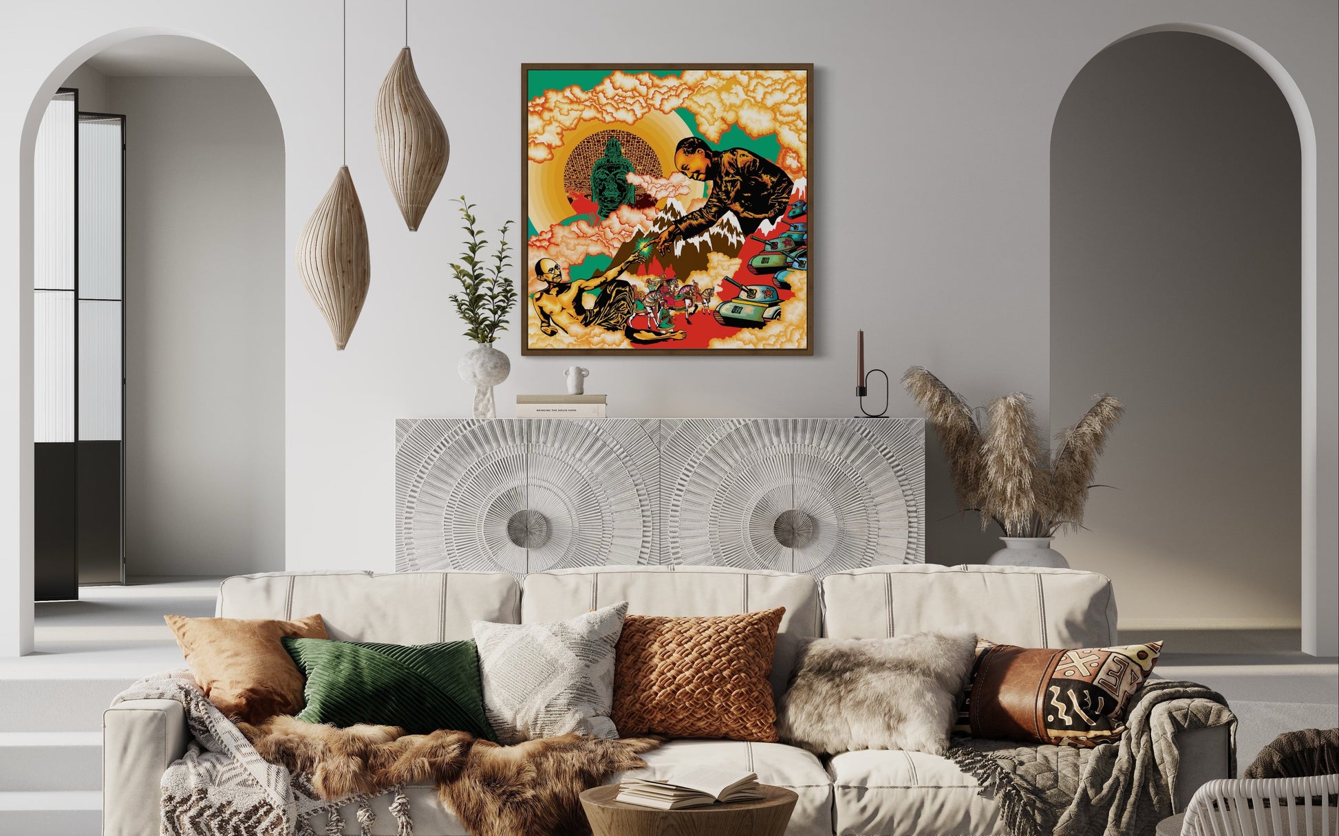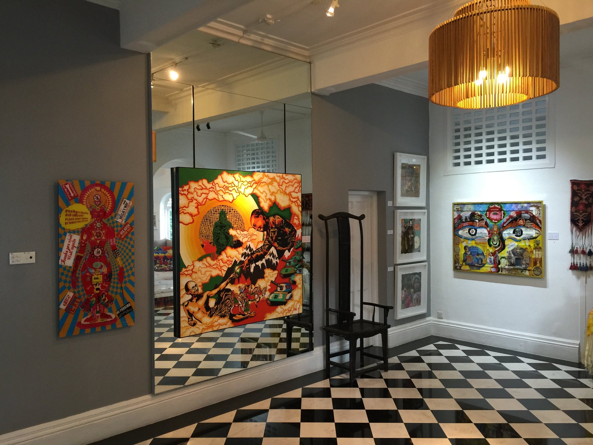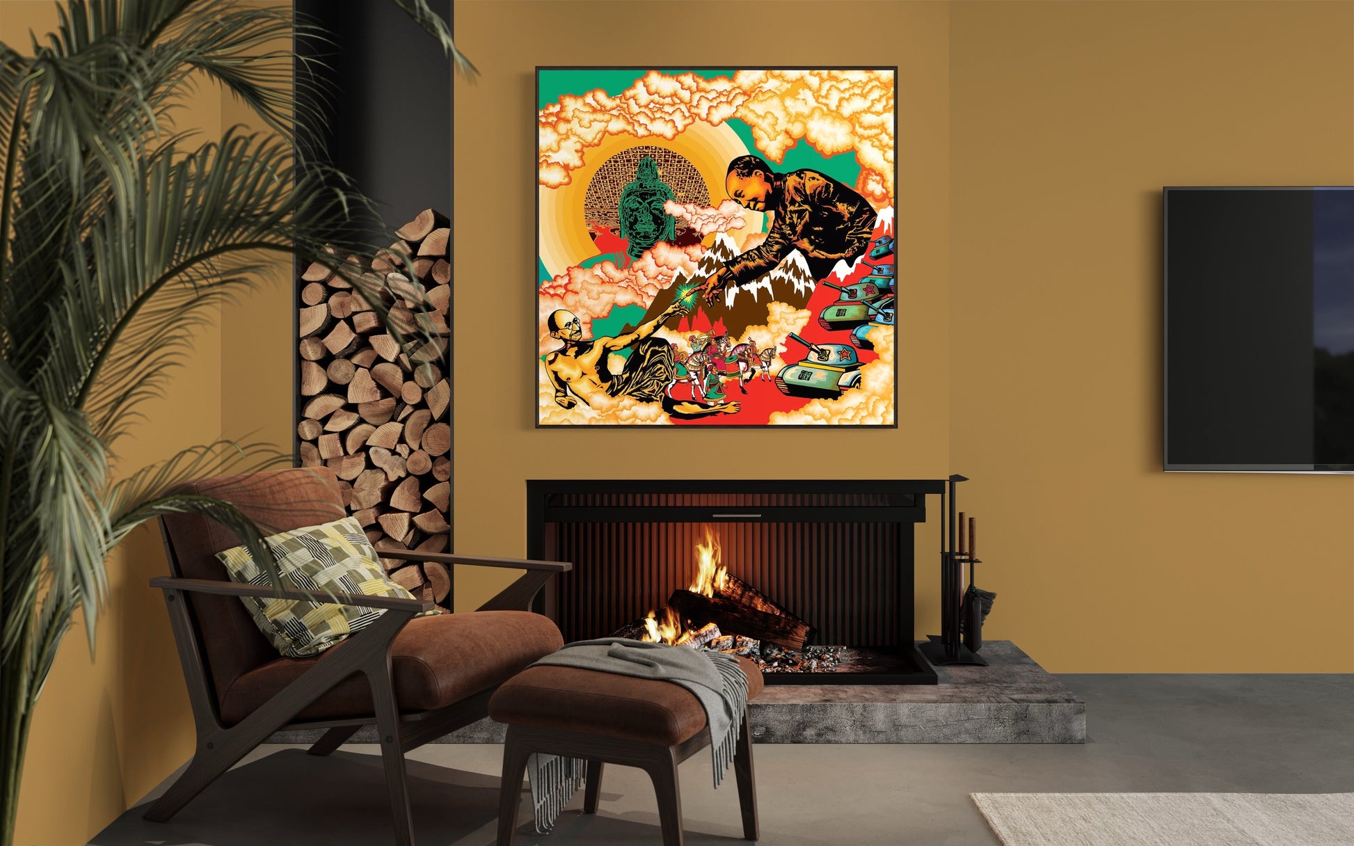 Additional notes: Using Michangelo's 'Creation of Adam' painting as a metaphorical anchor, Ketna Patel has composed a contemporary re-interpretation between God and mankind. Under the invisible but ever watchful eye of the Divine (represented here by Lord Buddha), the composition is showing two protagonists of modern Asia in symbolic positions. India is represented by a bare chested Mahatma Gandhi, who is vulnerable in his defencelessness as he is lying down on his back. China, on the other hand (represented by Mao) is in a threatening standing position, therefore having the upper hand. India is (naiively?) sending out celebrationary musical parties on horseback. China, on the other hand has its army tanks on standby. How is one to interpret the outcome of this snapshot? Could this moment be the creation of war, or would it indeed be the creation of peace? We do not know what the future holds.